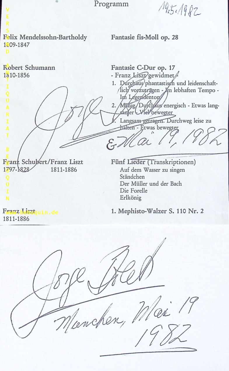 BOLET, Jorge (Pianist): eigenhändig signierte und datierte Programmseite + eigenhändiug signierte und datierte Autogrammkarte. München (Philharmonie), 19.5.1982. 12 x 12 cm. 2 Bl. Jorge Bolet (* 15. November 1914 in Havanna, Kuba; † 16. Oktober 1990 in Mountain View, Kalifornien, USA) war ein kubanischer Pianist mit amerikanischer Staatsbürgerschaft. (Wikipedia)
