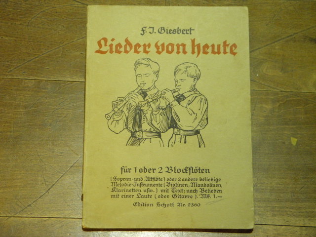 LIEDERBÜCHER.– GIESBERT, F.J.: Lieder von heute für 1 oder 2 Blockflöten. (Sopran und Altflöte oder 2 andere beliebige Melodie-Instrumente mit Text. Mainz (Schott), ca 1920. 64 S. mit Noten. ill.OKart. Rückdeckel mit Abriss. = Edition Nr. 2360. 1. Aufl. dieser Ausgabe.