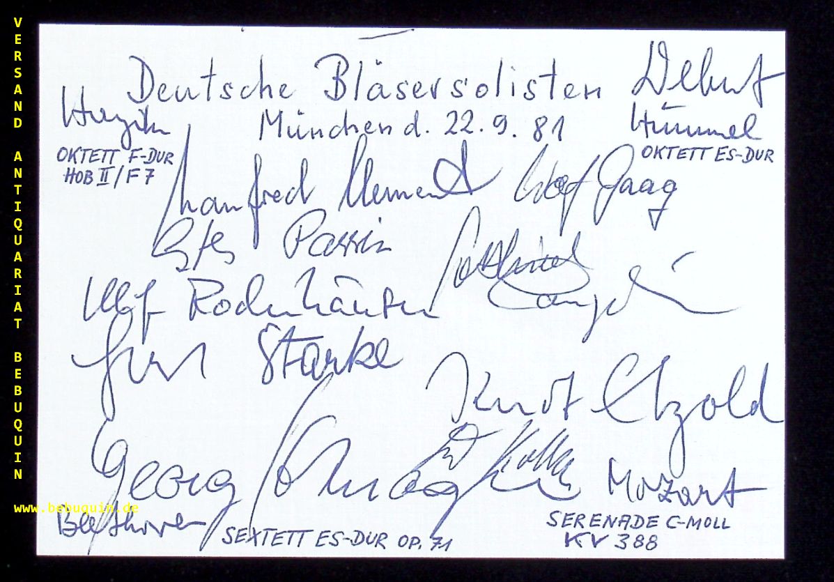 DEUTSCHE BLÄSERSOLISTEN.– CLEMENT, Manfred + PASSIN, Günter + RODENHÄUSER, Ulf + STARKE, Gerd + GAAG, Wolfgang + LANGENSTEIN, Gottfried + ETZOLD, Kurt + KOLBINGER, Kael + HÖRTNAGEL, Georg: eigenhändig von allen signierte und datierte Autogrammkarte. München (Philharmonie), 22.9.1981. 10,5 x 14,5 cm. 2 Bl. Zu den Deutschen Bläsersolitsten haben sich ausschließlich erste Solisten führender deutscher Sinfonieorchster zusammengefunden. z.B.: Wolfgang Gaag (* 1943 in Waldsassen) ist ein deutscher Hornist. Er war Professor für Horn an der Hochschule für Musik und Theater München und ist Gründungsmitglied im Ensemble German Brass. Er ist Träger der Ehrenmedaille der Musikhochschule München. (Wikipedia)