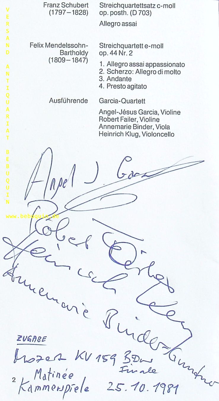 GARCIA MARTIN, Angel Jesus (Violinist) + FAILER, Robert + BINDER, Annemarie + KLUG, Heinrich: eigenhändig von allen signierte und datierte Programmseite. München, 25.10.1981. 19 x 10 cm. 1 Bl. Angel Jesus Garcia wurde geboren 1947. (Wikipedia)