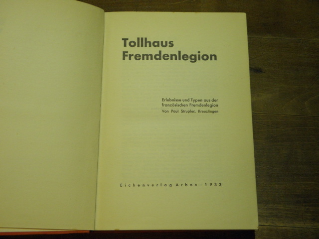 FREMDENLEGION.– STRUPLER, Paul: Tollhaus Fremdenlegion. Erlebnisse udn Typen aus der französischen Fremdenlegion. Arbon (Eichen), 1933. 189 S. OLn. Schnitt etwas stockig, Rücken geblichen. EA.