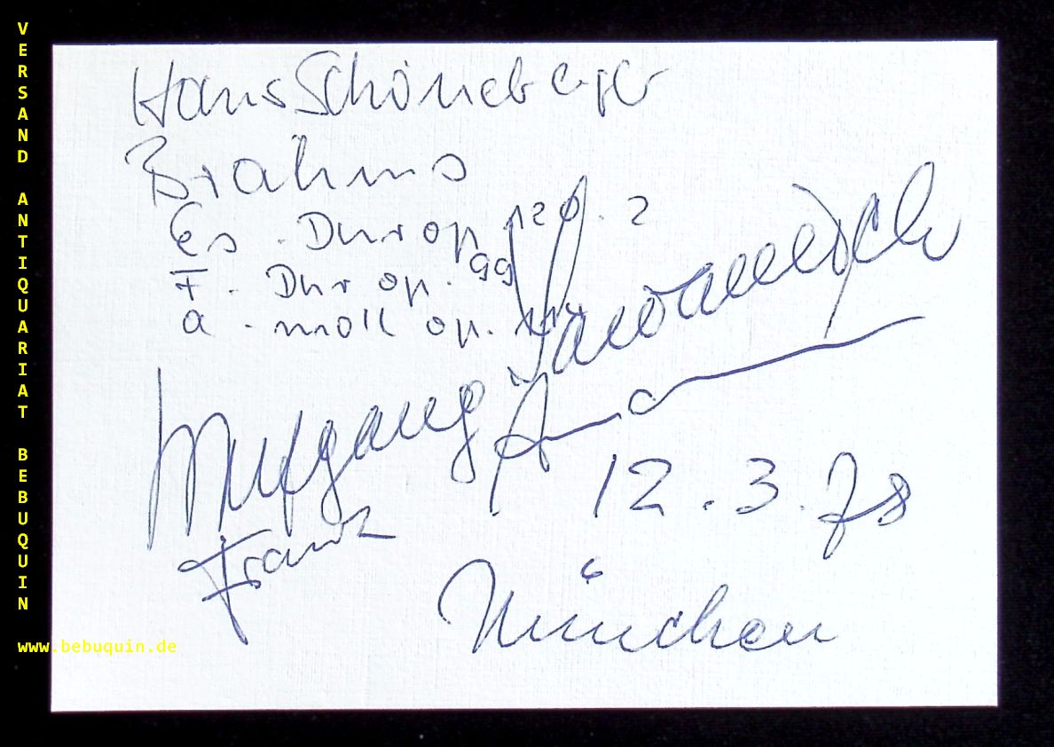 SAWALLISCH, Wolfgang (Pianist) + AMANN, Franz + SCHÖNEBERGER, Hans: eigenhändig von allen signierte und datierte Programmseite. München, 12.3.1978. 21 x 14 cm. 3 Blatt. Wolfgang Sawallisch (* 26. August 1923 in München; † 22. Februar 2013 in Grassau) war ein deutscher Dirigent und Pianist. Hans Schöneberger ist ein deutscher Musiker. Er war von 1971 bis 2007 als Solo-Klarinettist an der Bayerischen Staatsoper tätig. Er ist der Vater der Moderatorin Barbara Schöneberger. (Wikipedia)