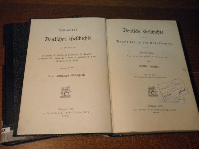 SCHULTZE, Walther: Deutsche Geschichte von der Urzeit bis zu den Karolingern. 2 Bände. Stuttgart (Cotta), 1894, 1896. 4°. XIII, 460, XII, 547 S. HLn der Zeit. Ordnungsgemäß aus Bundeswehrbeständen ausgesondertes Bibliotheksexemplar (Stempel, Rückenschild). = Bibliothek Deutscher Geschichte. EA.