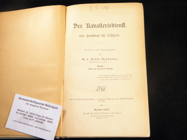 PFERDE.– PELET-NARBONNE, G.v.: (Hrsg.) Der Kavalleriedienst. Ein Handbuch für Offiziere. 4. völlig neu bearb. Aufl. Berlin (Mittler), 1897. IX, 552 S. mit 2 farb. Steindrucktafeln, 6 Vollbildern – 202 Textabb. sowie 11 Beilagen. ill. OLn. Ordnungsgemäß aus Bundeswehrbeständen ausgesondertes Bibliotheksexemplar (Stempel, Rückenschild), etwas bestaubt, Ecken leicht bestoßen. seltene Ausgabe.