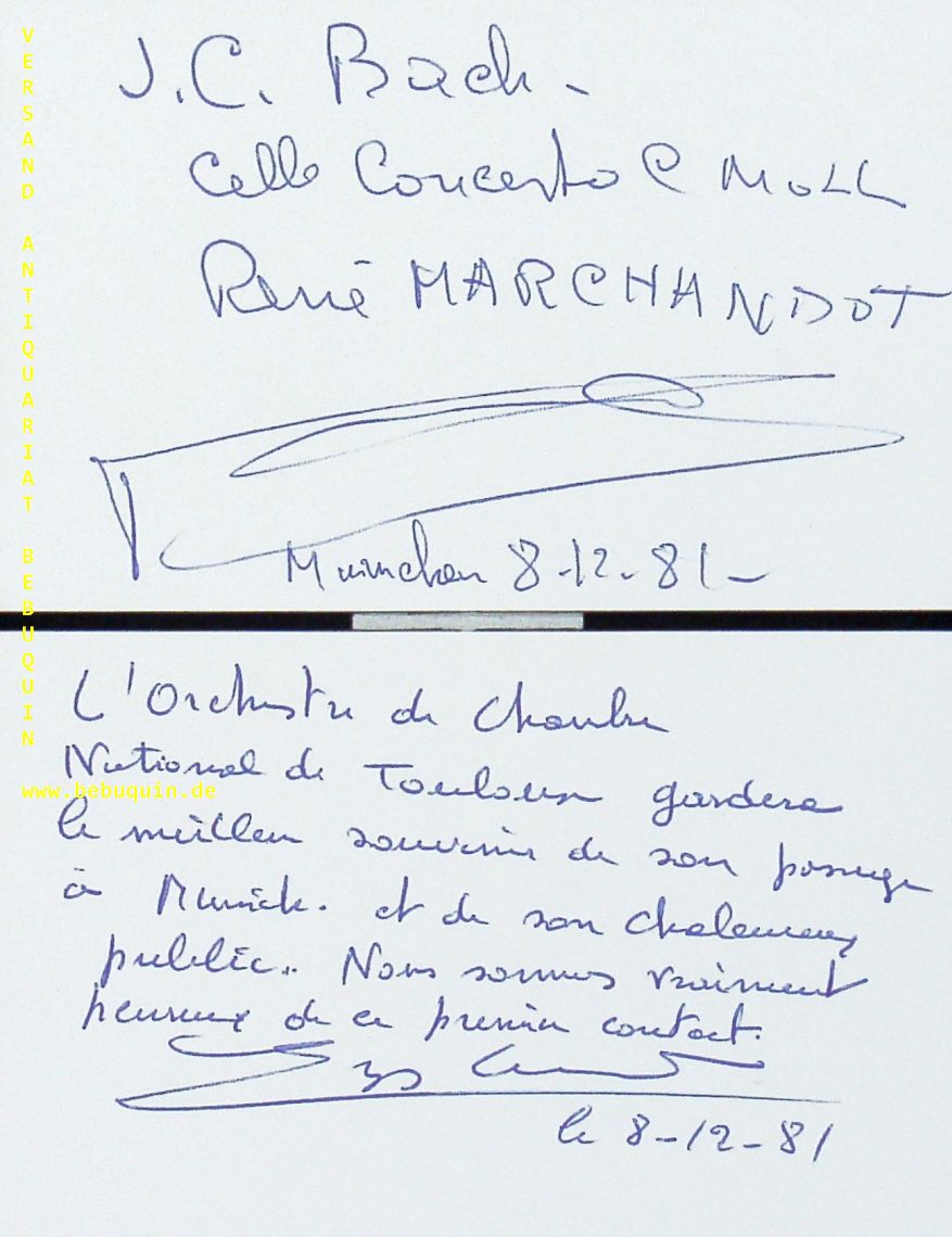 ARMAND, Georges )Dirigent) + MARCHANDOT, René (Cellist): 2 eigenhändig signierte Autogrammkarten. München (Philharmonie), 8.12.1981. 8 x 12,5 cm. 3 Bl.