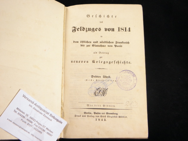 NAPOLEON.– DAMITZ, Karl von: Geschichte des Feldzuges von 1814 in dem östlichen und nördlichen Frankreich bis zur Einnahme von Paris. Als Beitrag zur neueren Kriegsgeschichte. 3. Theil. (Erste Abtheilung). Berlin (Mittler), 1843. X, 500 S. + 3 Faltpläne. Ln der Zeit. Ordnungsgemäß aus Bundeswehrbeständen ausgesondertes Bibliotheksexemplar (Stempel, Rückenschild). EA.