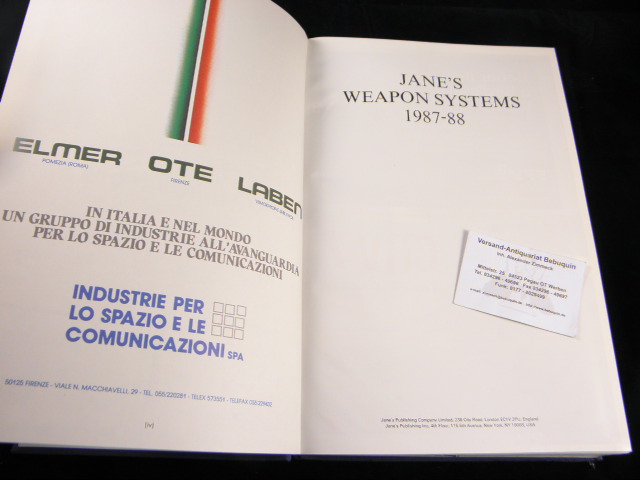 PRETTY, Ronald T.: (Ed.) Jane’s Weapon Systems. 1987-88. 18. Edition. London (Janes), 1987. Gr. 4°. 83, 1197 S. mit zahlr. Abb. OLn mit Silberprägung. Ordnungsgemäß aus Bundeswehrbeständen ausgesondertes Bibliotheksexemplar (Stempel, Rückenschild), gute Erhaltung. EA.