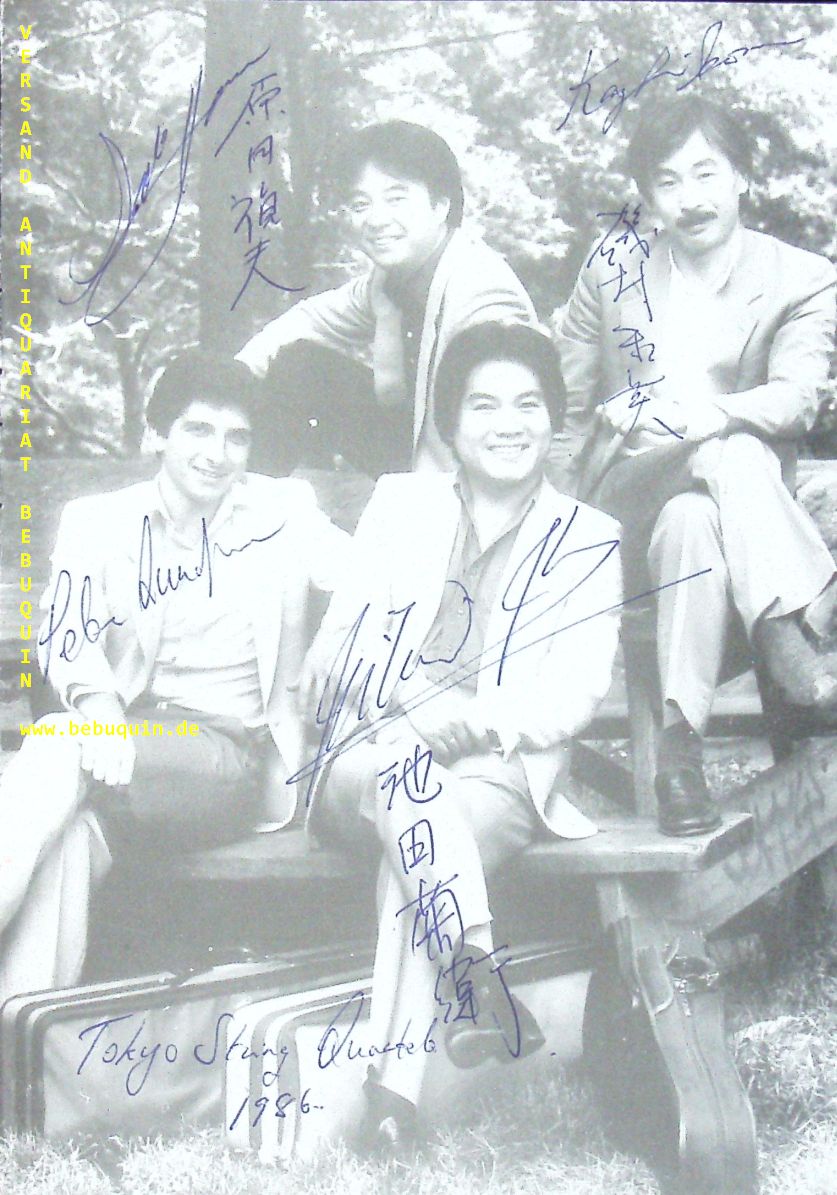 TOKYO STRING QUARTET: OUNDIJAN, Peter + IKEDA, Kikuei + ISOMURA, Kazuhide + HARADA, Sadao: eigenhändig (zweisprachig) signierte und datierte Portraitseite. München (Herkulessaal), 26.2.1986. 21 x 15 cm. 1 Bl. Das Tokyo String Quartet war ein renommiertes Streichquartettensemble, das 1969 an der Juilliard School of Music gegründet wurde und sich im Juli 2013 auflöste. (Wikipedia)
