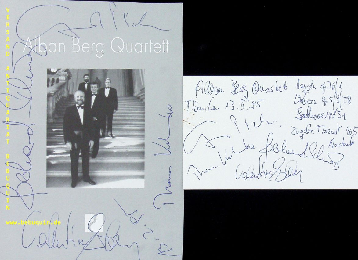 ALBAN BERG QUARTETT.– PICHLER, Günter + SCHULZ, Gerhard + KAKUSKA, Thomas + ERBEN, Valentin: eigenhändig von allen signierte und datierte Autogrammkarte und ebensolche Portraitseite. München (Herkulessaal), 13.2.1995. 19 x 13,5 cm. 2 Bl. Das Alban Berg Quartett war eines der weltweit führenden Streichquartette. (Wikipedia)