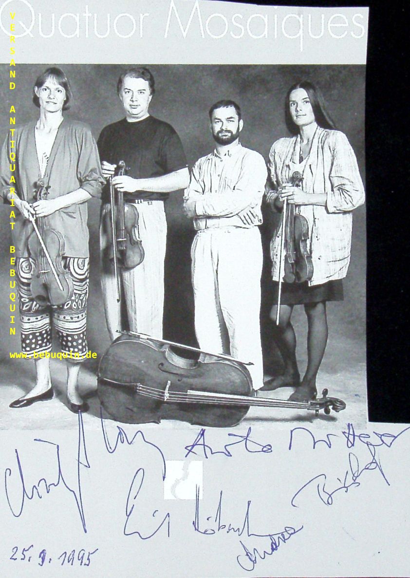 QUATUOR MOSAIQUES.– HÖBARTH, Erich + BISCHOF, Andrea + MITTERER, Anita + COIN, Christoph: eigenhändig von allen signierte und datierte Portraitseite. München (Herkulessaal), 25.9.1995. 18,5 x 13,5 cm. 3 Bl. Das Quatuor Mosaïques ist ein Streichquartettensemble, das 1989 in Wien von den Stimmführern des Concentus Musicus Wien gegründet wurde. Es widmet sich der historischen Aufführungspraxis auf Originalinstrumenten. (Wikipedia)