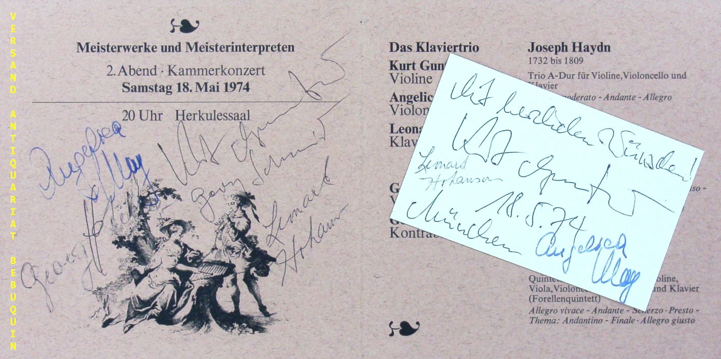 MAY, Angelica (Cellistin) + GUNTNER, Kurt (Violinist) + HOKANSON, Leonard (Pianist) + SCHMID, Georg (Bratschist) + HÖRTNAGEL, Georg (Bassist): eigenhändig von allen signierte und datierte Autogrammkarte: Mit herzlichen Grüßen + ebensolches Programm-Doppelblatt. München (Herkulessaal), 18.5.1974. 16,5 x 16,5 cm. 2 Bl. Autogramme von Angelica May (17.9.1933 – 7.1.2018) sind von großer Seltenheit. Angelica May war eine der renommiertesten deutschen Cellistinnen der Nachkriegszeit. Sie hatte das Glück, noch beim großen Pablo Casals studieren zu können. Angelica May gehörte zu den wenigen deutschen Cellistinnen, die sich nach dem Zweiten Weltkrieg einen internationalen Ruf erspielen konnten.