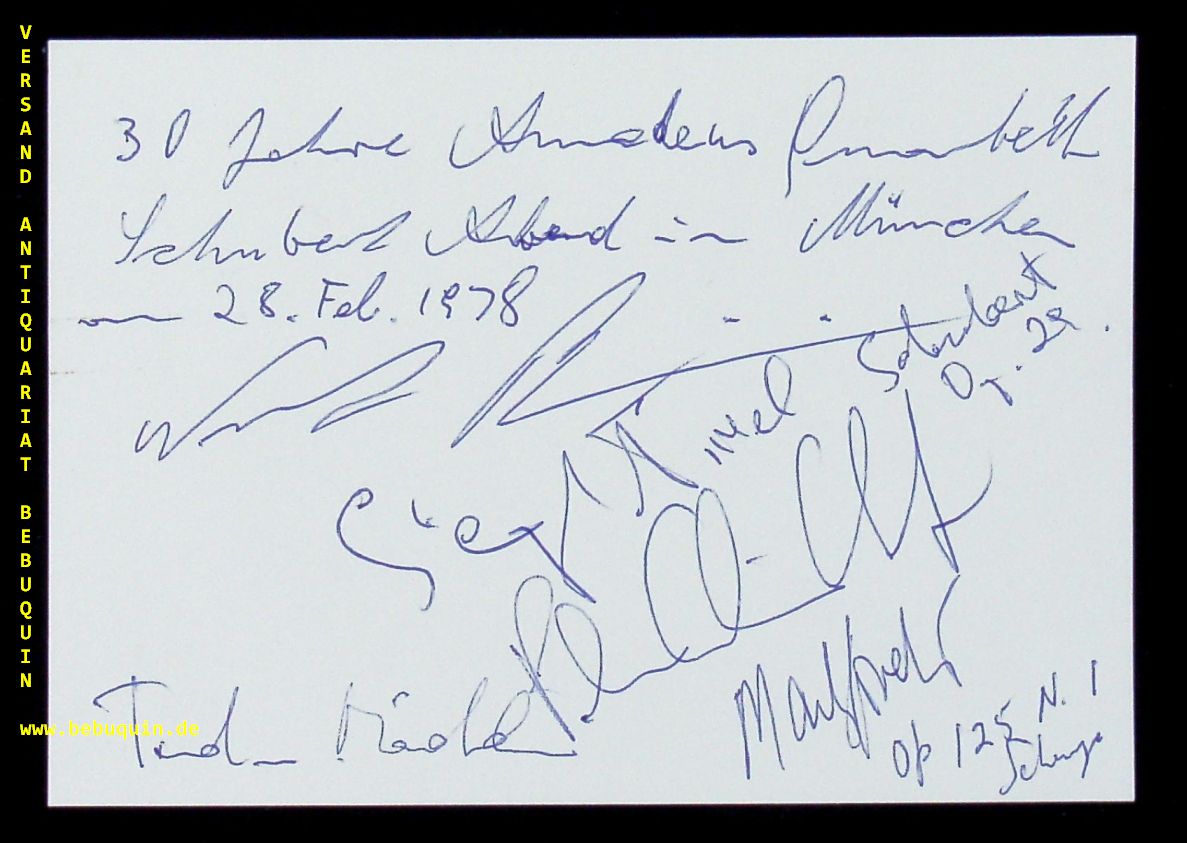 AMADEUS QUARTET.– SCHIDLOF, Peter + BRAININ, Norbert + NISSEL, Siegmund + LOVETT, Martin: eigenhändig von allen signierte und datierte Autogrammkarte. München, 28.2.1978. 10,5 x 14,5 cm. große Karteikarte. Das Amadeus-Quartett war ein bekanntes Streichquartett des 20. Jahrhunderts. Es wurde 1947 in London gegründet. (Wikipedia)