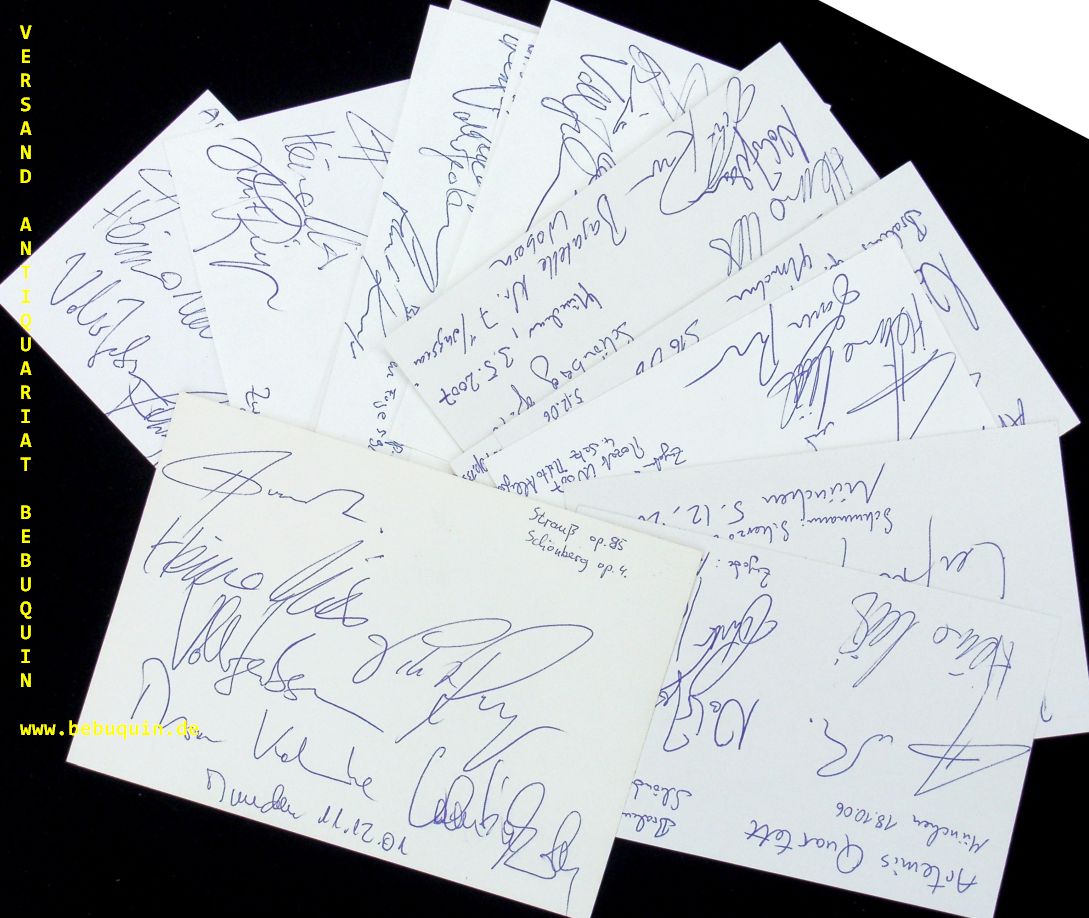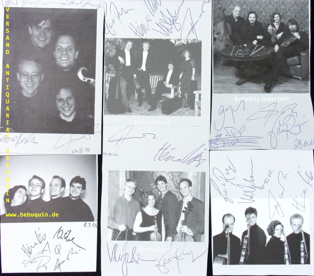 ARTEMIS QUARTETT.– PRISHEPENKO, Natalia + MÜLLER, Heime + JACOBSEN, Volker + RUNGE, Eckart: 14 eigenhändig von allen signierte und datierte Autogrammkarte + 6 ebensolche Portraitseite. München (Herkulessaal), 1997 – 2011. 20 x 13,5 + 8 x 12,5 cm. 20 Bl.
