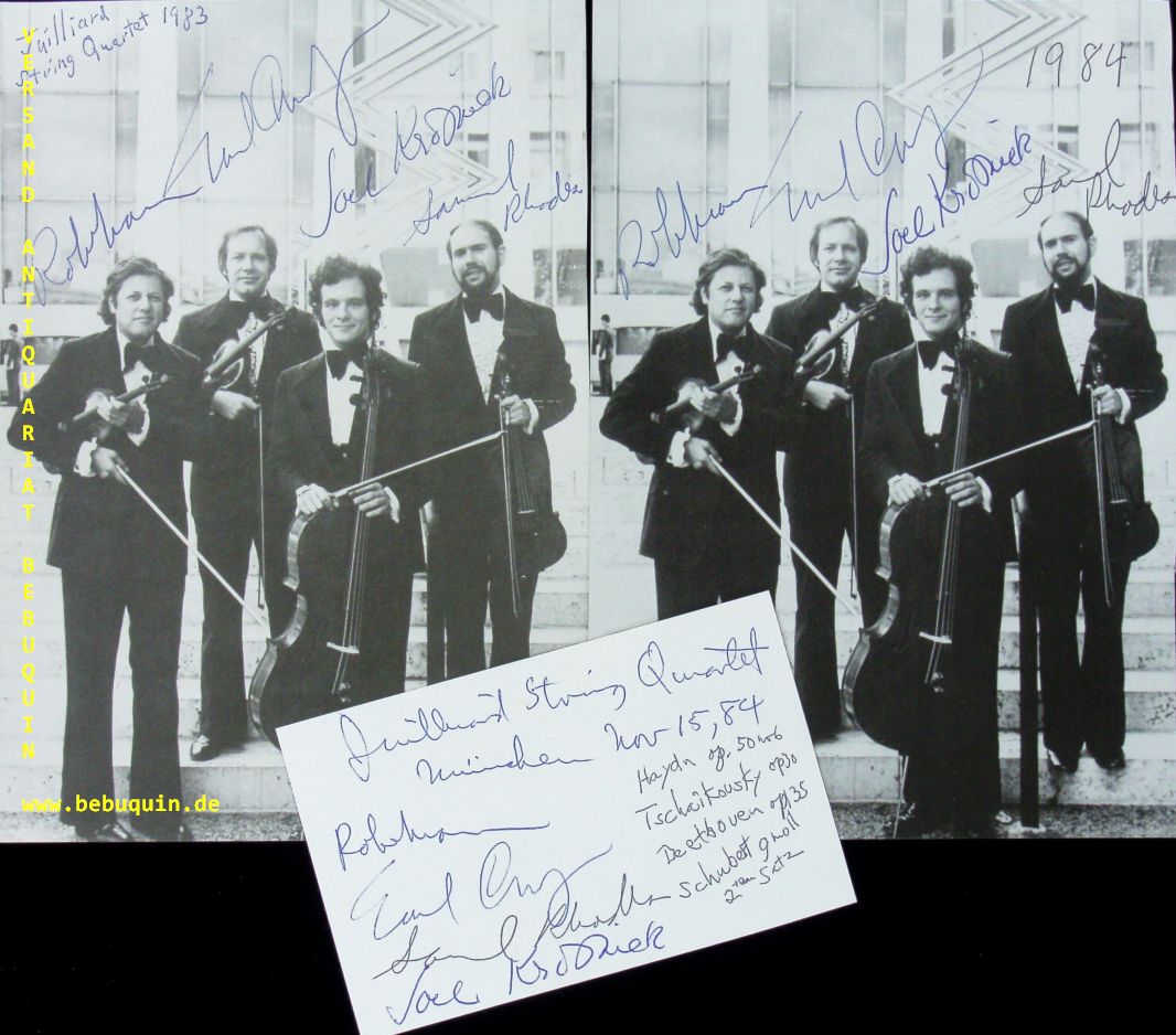JUILLARD STRING QUARTET.– MANN, Robert + CARYLESS, Earl + RHODES, Samuel + KROSNICK, Joel: eigenhändig von allen signierte und datierte Autogrammkarte + zwei eigenhändig signierte Portraitseiten. München (Philharmonie), 1983 + 1984. 21 x 15 + 8 x 12,5 cm. 6 Bl. Das Juilliard String Quartet gehört seit 1947, dem Jahr seines ersten Auftretens, zu den führenden Streichquartettensembles der Welt. Mit über 100 Veröffentlichungen ist das Juilliard String Quartet eines der am meisten aufgenommenen Streichquartettensembles der Welt und konnte bislang vier Grammys gewinnen. (Wikipedia)