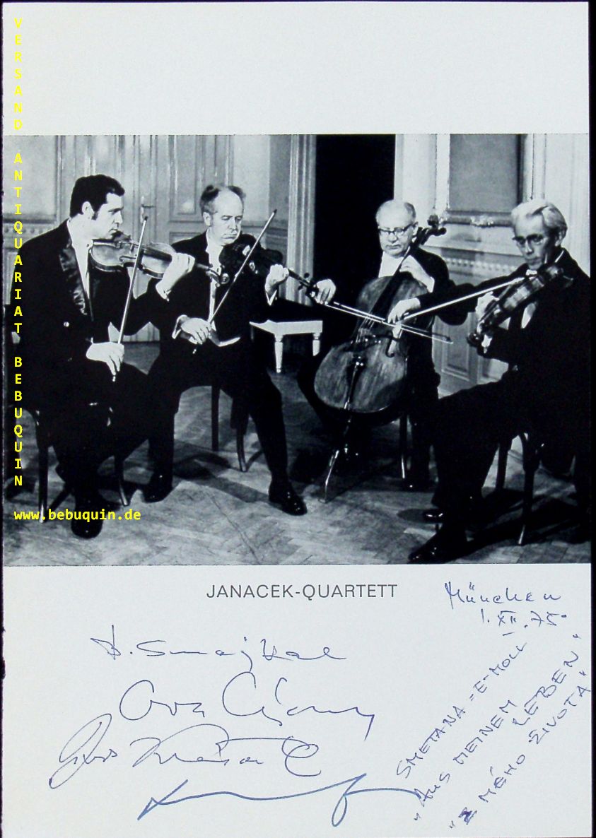 JANACEK QUARTETT.– SMEJKAL, Bohumil + SYKORA, Adolf + KRATOCHVIL, Jiri + KRAFKA, Katrel: eigenhändig von allen signierte und datierte Portraitseite. München (Herkulessaal), 1.12.1975. 21 x 15 cm. 2 Bl. The Janácek Quartet (Czech: Janáckovo kvarteto) is a Czech string quartet musical ensemble founded in 1947 which is still currently active. (Wikipedia)