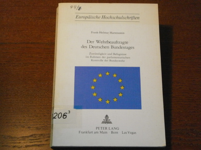 HARTENSTEIN, Frank-Helmut: Der Wehrbeauftragte des Deutschen Bundestages. Zuständigkeit und Befügnisse im Rahmen der parlamentarischen Kontrolle der Bundeswehr. Frankfurt a. M. (Lang), 1977. LXXV, 258 S. ill. OKart. Ordnungsgemäß aus Bundeswehrbeständen ausgesondertes Bibliotheksexemplar (Stempel und Rückenschild). = Europäische Hochschulschriften, Reihe II, Rechtswissenschaft, Bd. 175. EA.