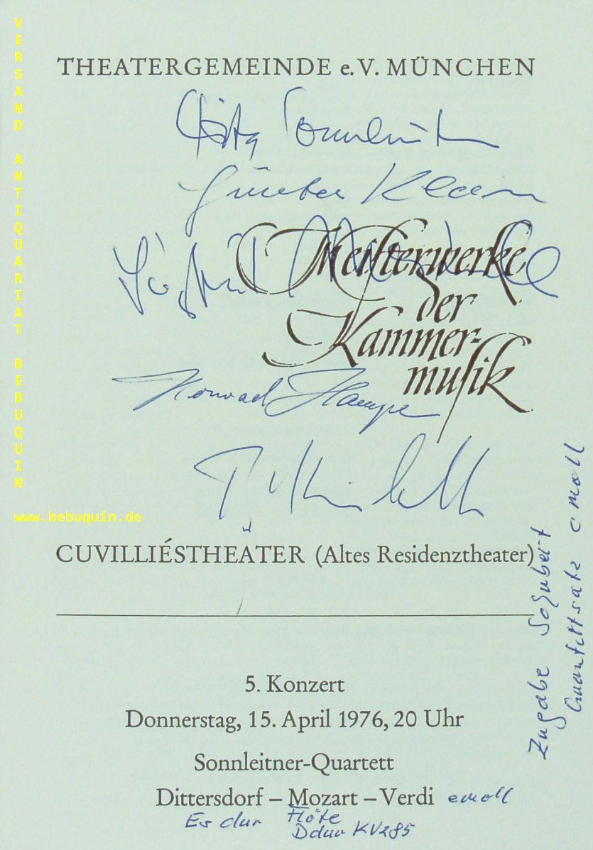 SONNLEITNER QUARTETT.– SONNLEITNER, Fritz (Violinist, Dirigent) + MEINECKE, Siegfried (Bratschist) + KLEIN, Günter + KISKALT, Fritz: eigenhändig datierte und von allen signiertes Programm der Thatergemeinde. München, 15.4.1976. 21 x 15 cm. 4 S.