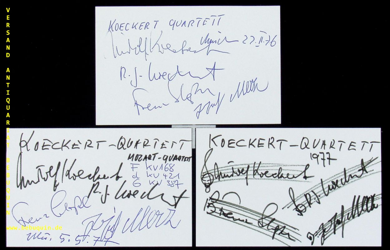 KOECKERT QUARTETT.– KOECKERT, Rudolf + Joachim, SCHESSL, Franz + MERZ, Josef: 3 eigenhändig von allen signierte und datierte Autogrammkarten. München (Herkulessaal); 1976 / 1977. 8 x 12,5 cm. 3 Karteikarten. Rudolf Josef Koeckert (* 27. Juni 1913 in Großpriesen, Böhmen; † 7. September 2005 in München) war ein deutscher Violinist. (Wikipedia)
