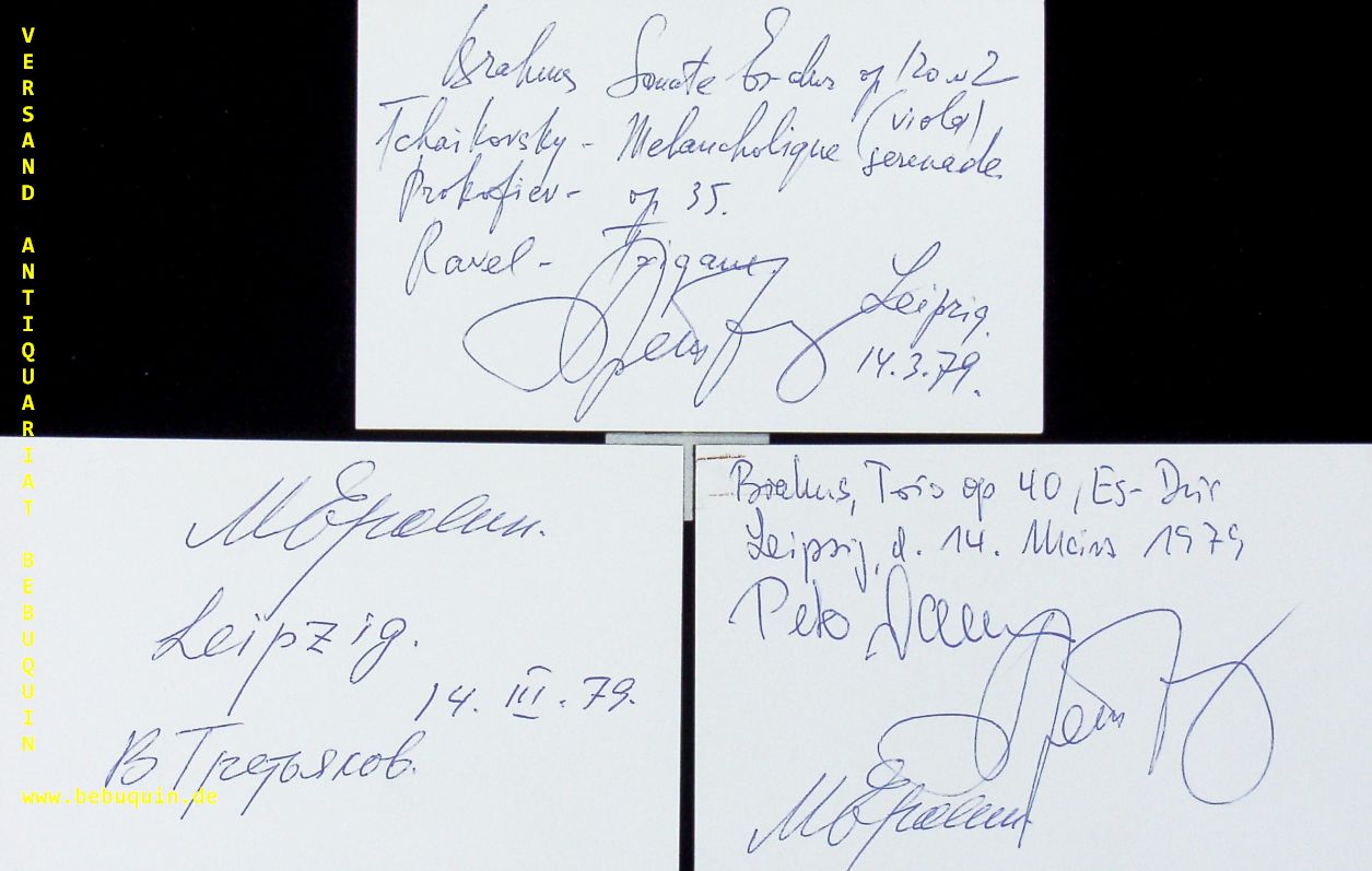 TRETJAKOW, Viktor (Dirigent, Violinist) + JERROCHIM, Michail (Pianist) + DAMM, Peter (Hornist):: 3 eigenhändig signierte und datierte Autogrammkarten. München (Herkulessaal), 14.3.1979. 8 x 12,5 cm. 3 Karteikarten in Programmheft. Wiktor Wiktorowitsch Tretjakow (* 17. Oktober 1946 in Krasnojarsk, Sibirien) ist ein russischer Violinist und Dirigent. (Wikipedia)