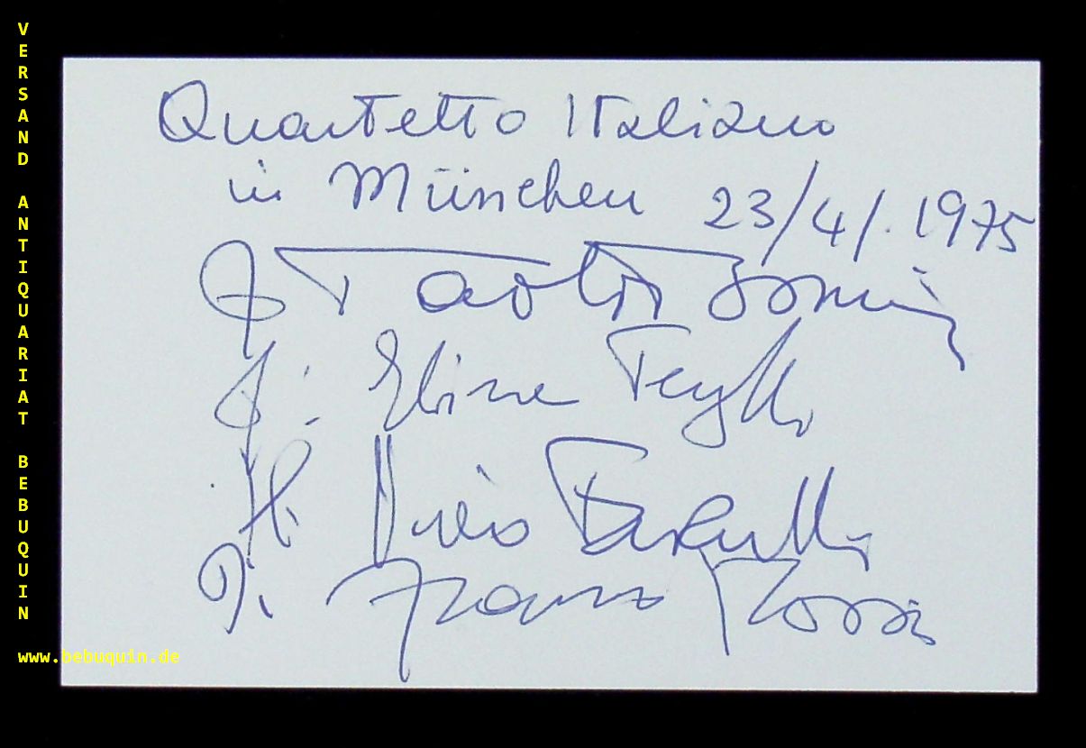 QUARTETTO ITALIANO.– BORCIANI, Paolo + PEGREFFI, Elisa + ROSSI, Franco + FARULLI, Piero: eigenhändig von allen signierte Autogrammkarte. München (Herkulessaal), 23.4.1975. 8 x 12,5 cm. 4 Bl. Das Quartetto Italiano war ein italienisches Streichquartett, das über drei Jahrzehnte immer in der gleichen, 1947 gefundenen Formation spielte. Nur in den letzten Jahren kam es 1977 nochmals mit Dino Asciolla zu einer Neubesetzung, der an Farullis Stelle trat. Mit dem Tod des Primargeigers Paolo Borciani im Jahre 1985 löste sich das Quartetto Italiano auf. (Wikipedia)
