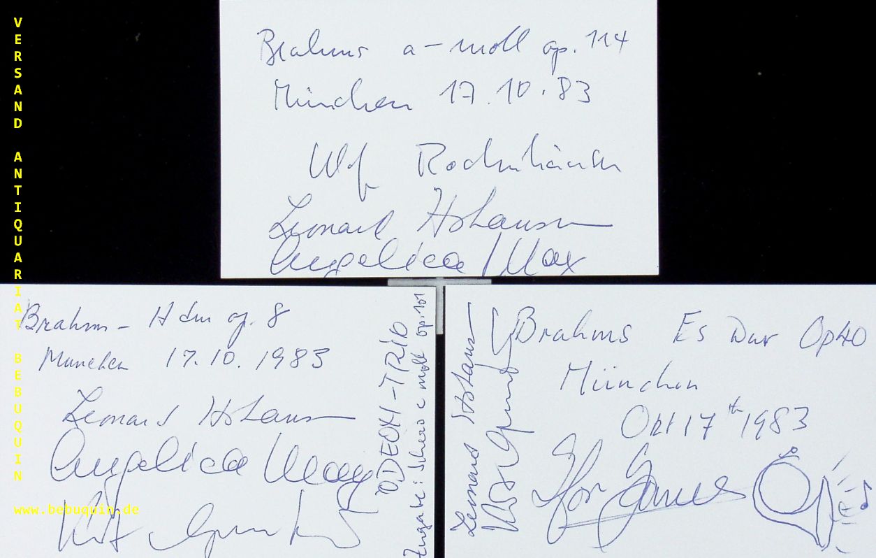 ODEON TRIO.– JAMES, Ifor (Hornist) + RODENHÄUSER, Ulf (Klarinettist) + MAY, Angelica (Cellistin) + GUNTNER, Kurt (Violinist) + HOKANSON, Leonard (Pianist): 3 eigenhändig von allen signierte und datierte Autogrammkarten. München (Herkulessaal), 17.10.1983. 8 x 12,5 cm. 7 Bl.