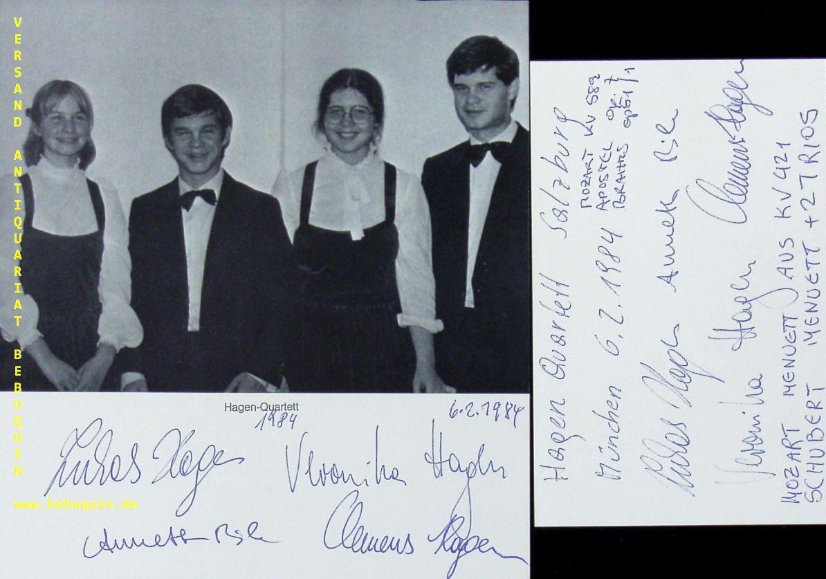 HAGEN QUARTETT.– HAGEN, Lukas + Veronika + Clemens + BIK, Annette: eigenhändig signierte und datierte Autogrammkarte und ebensolche Portraitseite. München (Herkulessaal), 6.2.1984. 16 x 14,5 cm. 3 Bl. Das Hagen Quartett ist ein in den 1970er Jahren gegründetes Streichquartettensemble aus Salzburg und gehört zu den führenden Streichquartetten der Welt. Es bestand ursprünglich aus vier Geschwistern, von denen drei nach wie vor in dem Quartett musizieren. Bekannt wurde das Hagen-Quartett besonders durch seine Gesamteinspielung der Streichquartette Mozarts. (Wikipedia)