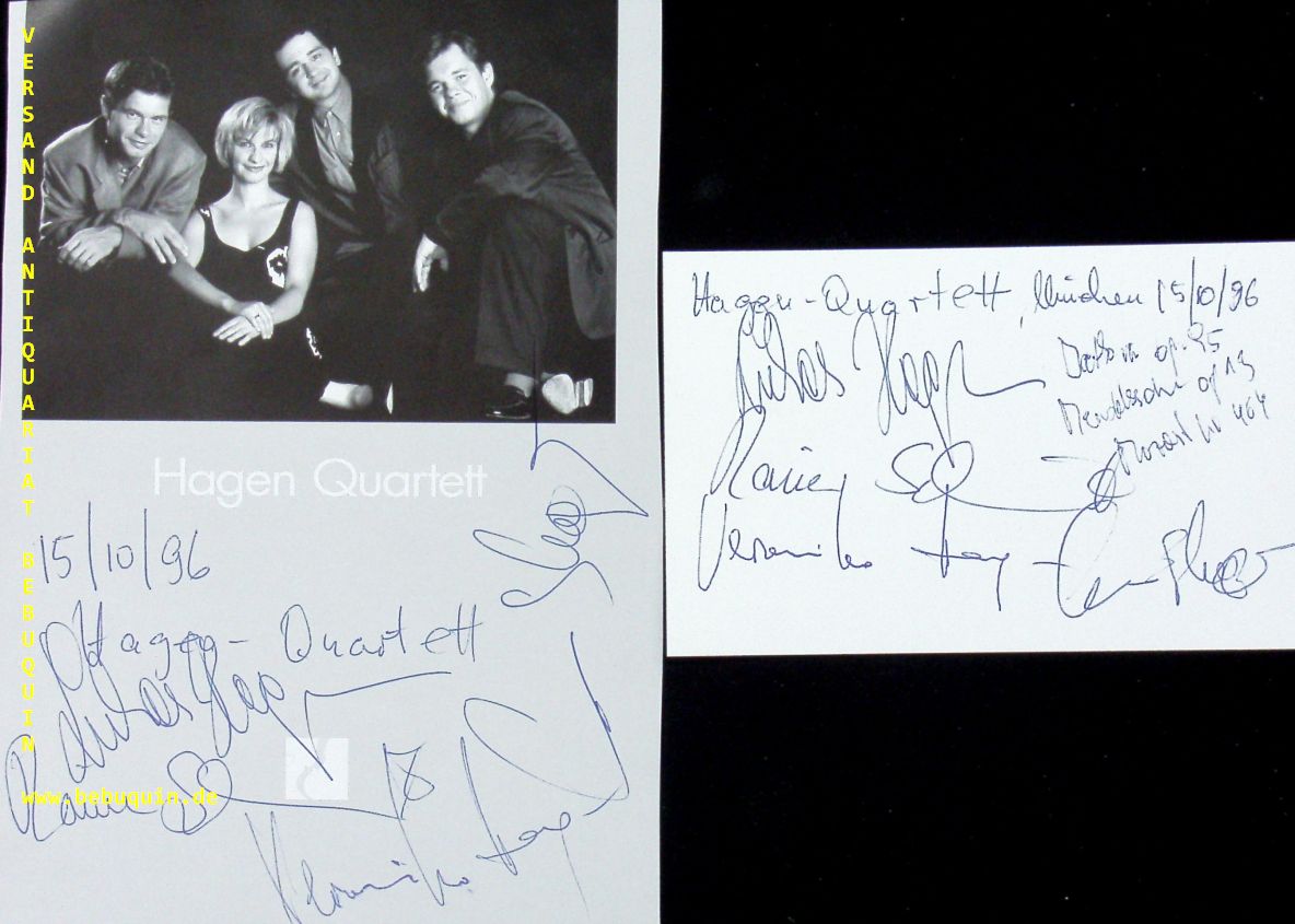 HAGEN QUARTETT.– HAGEN, Lukas + Veronika + Clemens + SCHMIDT, Rainer: eigenhändig signierte und datierte Autogrammkarte + ebensolche Portraitseite. München (Philharmonie), 15.10.1996. 18,5 x 13 cm. 4 Bl Das Hagen Quartett ist ein in den 1970er Jahren gegründetes Streichquartettensemble aus Salzburg und gehört zu den führenden Streichquartetten der Welt. Es bestand ursprünglich aus vier Geschwistern, von denen drei nach wie vor in dem Quartett musizieren. Bekannt wurde das Hagen-Quartett besonders durch seine Gesamteinspielung der Streichquartette Mozarts. (Wikipedia)