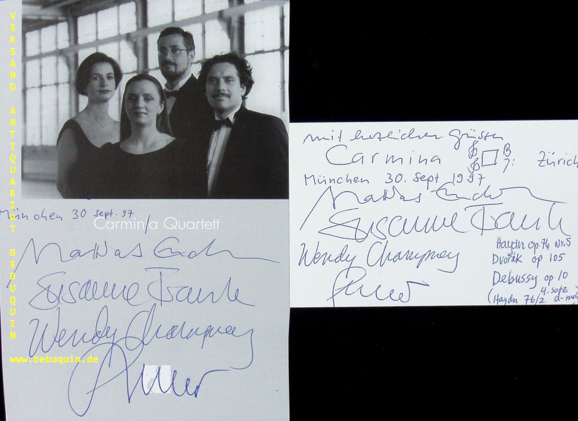 CARMINA QUARTETT.– ENDERLE, Matthias + FRANK, Susanne + CHAMPNEY, Wendy + GOERNER, Stephan: eigenhändig von allen signierte und datierten Autogrammkarten + ebenfalls signierte Portraitseite. München (Herkulessaal), 30.9.1997. 18,5 x 13 cm. 4 Bl. Das Carmina Quartett ist ein schweizerisches Streichquartett, das im Jahr 1984 gegründet wurde. (Wikipedia)