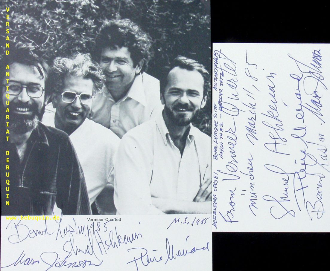 VERMEER-QUARTETT.– ASHKENASI, Shmuel + MENARD, Pierre + ZASLAV, Bernard + JOHNSON, Marc: eigenhändig von allen signierte und datierte Autogrammkarte + ebensolche Portraitseite. München, 11.3.1985. 19 x 14 cm. 3 Bl. The Vermeer Quartet was a string quartet founded in 1969 at the Marlboro Music Festival in Vermont and active until 2007. (Wikipedia)