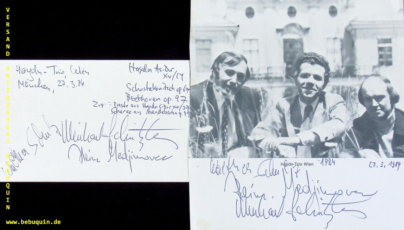 HAYDN TRIO WIEN.– MEDJIMOREC, Heinz + SCHNITZLER, Michael + SCHULZ, Walther: eigenhändig signierte und datierte Autogrammkarte + ebensolche Portraitseite über dem Foto von allen eigenhändig signiert und datiert. München (Philharmonie), 27.3.1984. 15,5 x 14 cm. 3 Bl. Das Haydn-Trio Wien (benannt nach dem Komponisten Joseph Haydn) ist ein österreichisches Kammermusik-Ensemble, das im Jahre 1964 gegründet wurde. Die Mitglieder studierten an der Wiener Musikakademie, Universität für Musik und darstellende Kunst Wien und spielen seit 1968 in der heutigen Besetzung. Das Klaviertrio widmet sich der originalgetreuen Interpretation von Werken klassischer Musik. (Wikipedia)