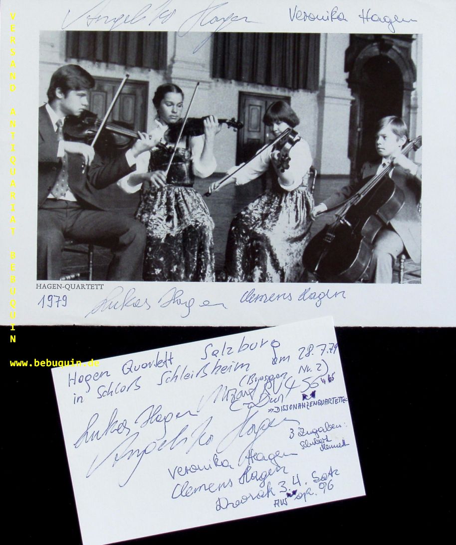 HAGEN QUARTETT.– HAGEN, Lukas + Veronika + Clemens + Angelika: eigenhändig signierte und datierte Autogrammkarte und ebensolche Portraitseite. München (Herkulessaal), 28.7.1979. 15 x 21 cm. 2 Bl. Das Hagen Quartett ist ein in den 1970er Jahren gegründetes Streichquartettensemble aus Salzburg und gehört zu den führenden Streichquartetten der Welt. Es bestand ursprünglich aus vier Geschwistern, von denen drei nach wie vor in dem Quartett musizieren. Bekannt wurde das Hagen-Quartett besonders durch seine Gesamteinspielung der Streichquartette Mozarts. Hier noch in der ursprünglichen Konstellaztion. (Wikipedia)