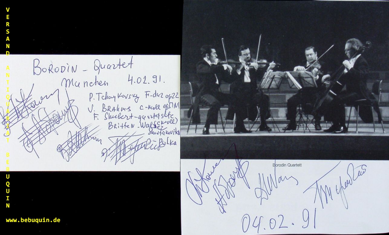 BORODIN QUARTETT.– KOPELMAN, Mikhail + ABRAMENKOW, Andrej + SCHEBALIN, Dmitri + BERLINSKY, Valentin: eigenhändig von allen Künstlern signierte und datierte Autogrammkarte + ebensoclhe Portraitseite. München (Herkulessaal), 4.2.1991. 16 x 14,5 cm. 3 Bl. Das Borodin-Quartett ist ein Streichquartett und wurde im Jahre 1945 in der früheren Sowjetunion als Moskauer Philharmonisches Quartett gegründet. Es ist eines der am längsten existierenden Streichquartette und war auch während des Kalten Krieges eines der im Westen bekanntesten sowjetischen Ensembles, da es häufig Konzerte in den europäischen Ländern und in den USA absolvierte. (Wikipedia)