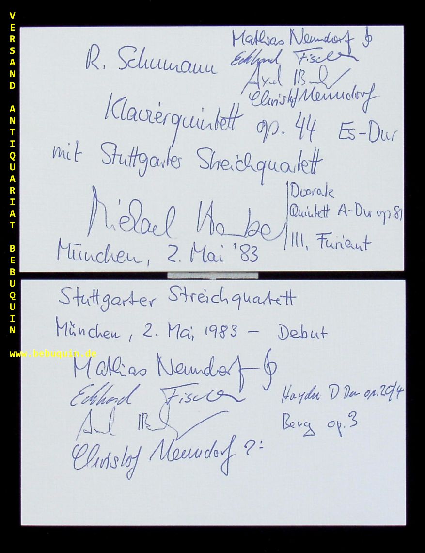 STUTTGARTER STREICHQUARTETT.– HAUBER, Michael (Pianist) + NEUNDORF, Mathias + FISCHER, Eckhard + BREUCH, Axel + NEUNDORF, Christof: eigenhändig von allen signierte und datierte Portraitseite sowie 2 ebenfalls signierte Autogrammkarten. München (Herkulessaal), 2.5.1983. 20 x 14 cm. 4 Bl. Rainer Kussmaul (* 3. Juni 1946 in Mannheim; † 27. März 2017 in Freiburg im Breisgau) war ein deutscher Violinist und Dirigent. (Wikipedia)