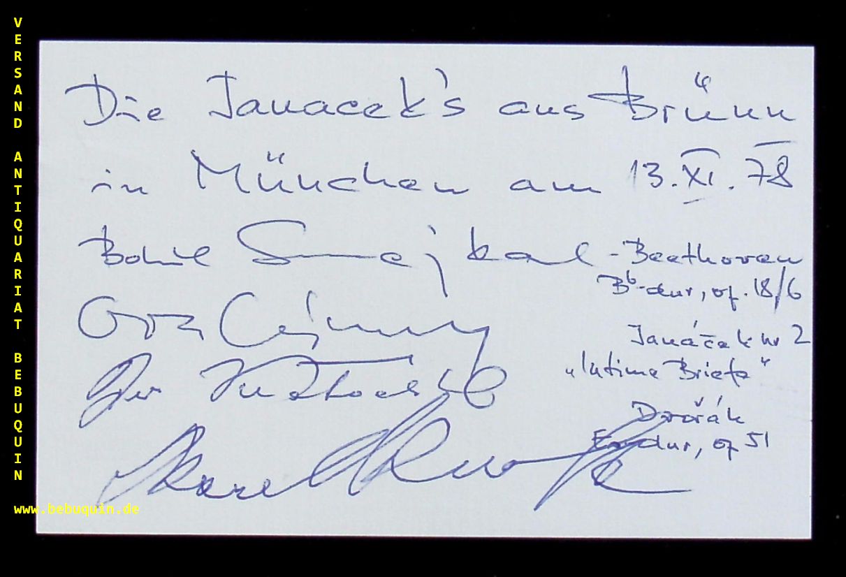 JANACEK QUARTETT.– SMEJKAL, Bohumil + SYKORA, Adolf + KRATOCHVIL, Jiri + KRAFKA, Katrel: eigenhändig von allen signierte und datierte Autogrammkarte. München (Herkulessaal), 13.11.1978. 8 x 12,5 cm. 2 Bl. The Janácek Quartet (Czech: Janáckovo kvarteto) is a Czech string quartet musical ensemble founded in 1947 which is still currently active. (Wikipedia)