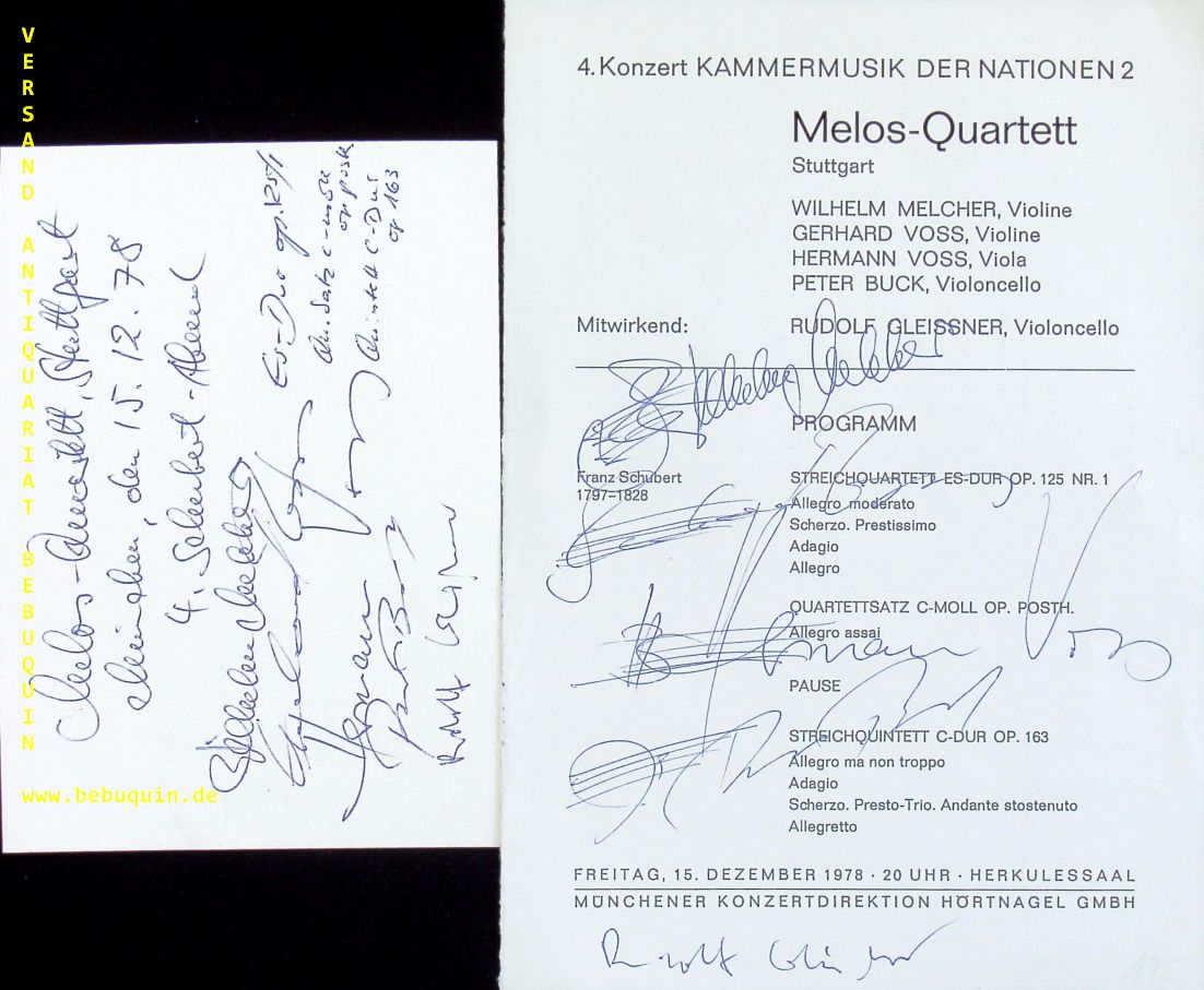 MELOS QUARTETT.– GLEISSNER, Rudolf (Cellist) + MELCHER, Wilhelm + VOSS, Gerhard + Hermann + BUCK, Peter: eigenhändig von allen signierte und datierte Autogrammkarte sowie ebensolche Programsmseite. München (Herkulessaal), 15.12.1978. 21 x 14 + 10,5 x 14,5 cm. 3 Bl. Rudolf Gleißner (* 17. März 1942 in Nürnberg) ist ein deutscher Cellist. Er studierte Violoncello bei André Navarra, Enrico Mainardi und Pablo Casals. Sein musikalisches Denken ist stark von der Zusammenarbeit mit Sergiu Celibidache beeinflusst. Das Melos Quartett mit Sitz in Stuttgart zählte zu den renommierten Streichquartettensembles der Welt. Es wurde 1965 von Wilhelm Melcher (1. Violine), Gerhard Voss (2. Violine), Hermann Voss (Viola) und Peter Buck (Cello) gegründet und bestand 40 Jahre lang bis zum Jahr 2005. (Wikipedia)