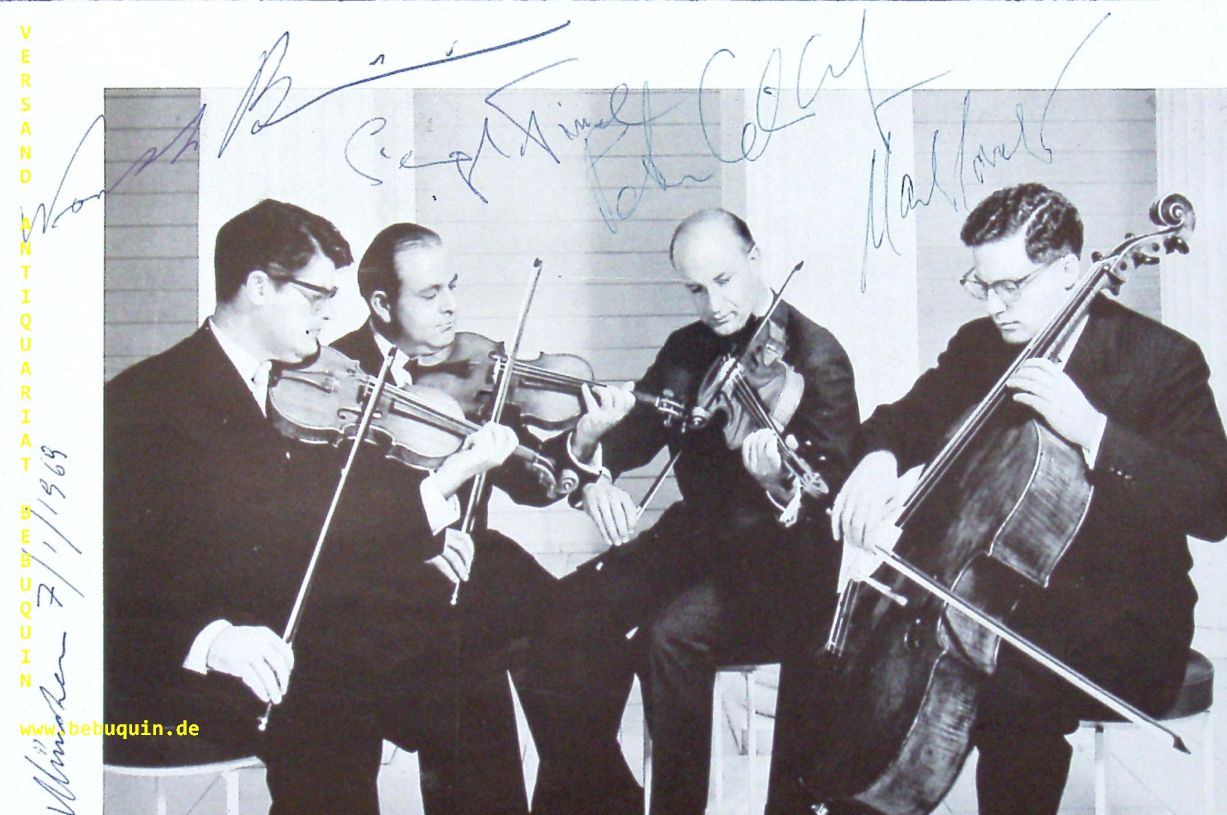 AMADEUS QUARTET.– SCHIDLOF, Peter + BRAININ, Norbert + NISSEL, Siegmund + LOVETT, Martin: eigenhändig von allen signierte und datierte Portraitseite. München, 7.1.1969. 13 x 19,5 cm 1 Bl. Das Amadeus-Quartett war ein bekanntes Streichquartett des 20. Jahrhunderts. Es wurde 1947 in London gegründet. (Wikipedia)