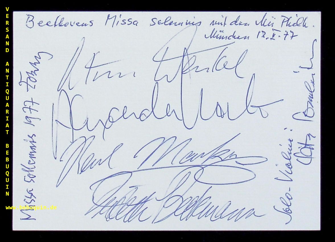 BECKMANN, Judith + WENKEL, Ortrun + MARKUS, Karl + MALTA, Alexander: eigenhändig von allen signierte und datierte Autogrammkarte. München, 13.2.1977. 10,5 x 14,5 cm. große Karteikarte. = Rudolf Kempe Gedenkkonzert.
