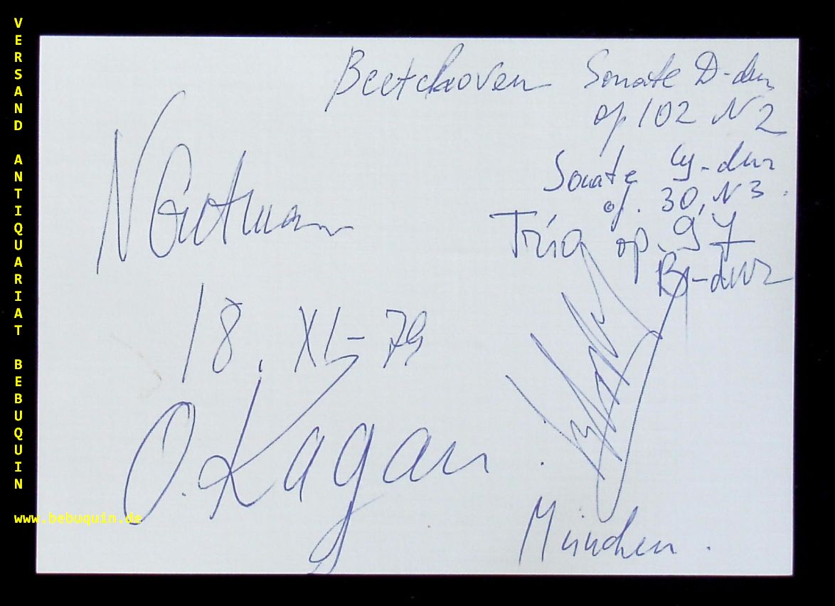 KAGAN, Oleg + GUTMAN, Natalia + LOBANOV, Vasilij: eigenhändig von allen signierte und datierte Autogrammkarte. München (Herkulessaal), 18.11.1979. 10,5 x 14,5 cm. große Karteikarte. Oleg Moissejewitsch Kagan (* 22. November 1946 in Juschno-Sachalinsk; † 15. Juli 1990 in München) war ein russischer Violinvirtuose. Natalja Grigorjewna Gutman (* 14. November 1942 in Kasan) ist eine russische Cellistin. Vassily Lobanov ist ein russischer Pianist und Komponist. Lobanov studierte von 1963 bis 1971 am Moskauer Konservatorium Klavier bei Lew Naumow und Komposition bei Sergei Balassanjan. Er studierte außerdem bei Juri Cholopow und Alfred Schnittke. (Wikipedia)