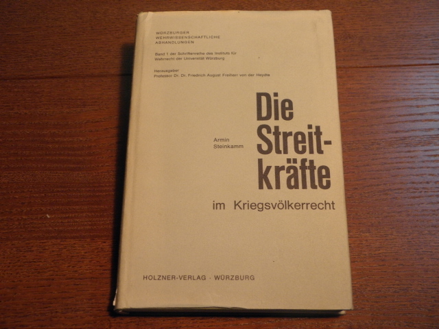 STEINKAMM, Armin A.: Die Streitkräfte im Kriegsvölkerrecht. Würzburg (Holzner), 1967. Gr. 8°. 403 S. OLn. Ordnungsgemäß aus Bundeswehrbeständen ausgesondertes Bibliotheksexemplar (Stempel, Rückenschild). = Würzbuger Wissenschaftliche Abhandlungen, Bd. 1. EA.