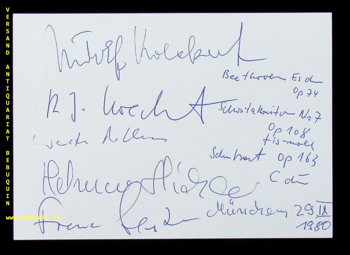 KOECKERT QUARTETT.– KOECKERT, Rudolf + Joachim, SCHESSL, Franz + STIEHLER, Helmar + NOTHAS, Walter: eigenhändig von allen signierte und datierte Autogrammkarte. München (Herkulessaal); 29.9.1980. 10,5 x 14,5 cm. 4 Bl. Rudolf Josef Koeckert (* 27. Juni 1913 in Großpriesen, Böhmen; † 7. September 2005 in München) war ein deutscher Violinist. (Wikipedia)