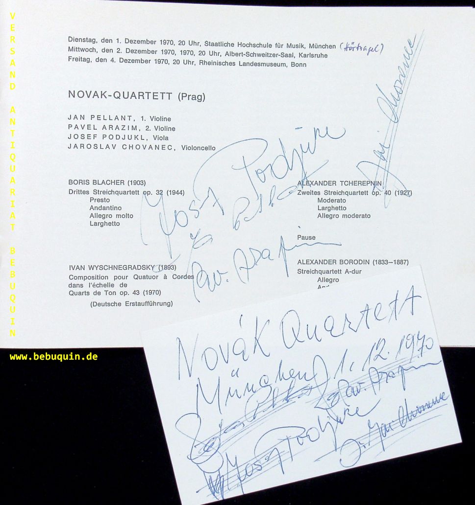 NOVAK QUARTETT.– PELLANT, Jan + ARAZIM, Pavel + PODJUKL, Josef + CHOVANEC, Jaroslav: eigenhändig von allen signierte und datierte Autogrammkarten + ebensolches Programmheft. München (Herkulessaal), 1.12.1970. 15 x 21 cm. 4 Bl. ill. OBr. selten.
