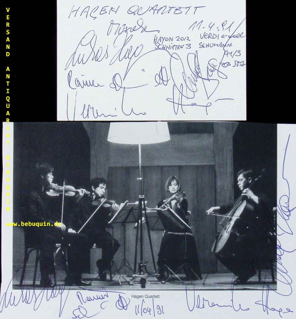 HAGEN QUARTETT.– HAGEN, Lukas + Veronika + Clemens + SCHMIDT, Rainer: eigenhändig signierte und datierte Autogrammkarte + ebensolche Portraitseite. München (Philharmonie), 11.4.1991. 13 x 19,5 cm. 5 Bl. Das Hagen Quartett ist ein in den 1970er Jahren gegründetes Streichquartettensemble aus Salzburg und gehört zu den führenden Streichquartetten der Welt. Es bestand ursprünglich aus vier Geschwistern, von denen drei nach wie vor in dem Quartett musizieren. Bekannt wurde das Hagen-Quartett besonders durch seine Gesamteinspielung der Streichquartette Mozarts. (Wikipedia)