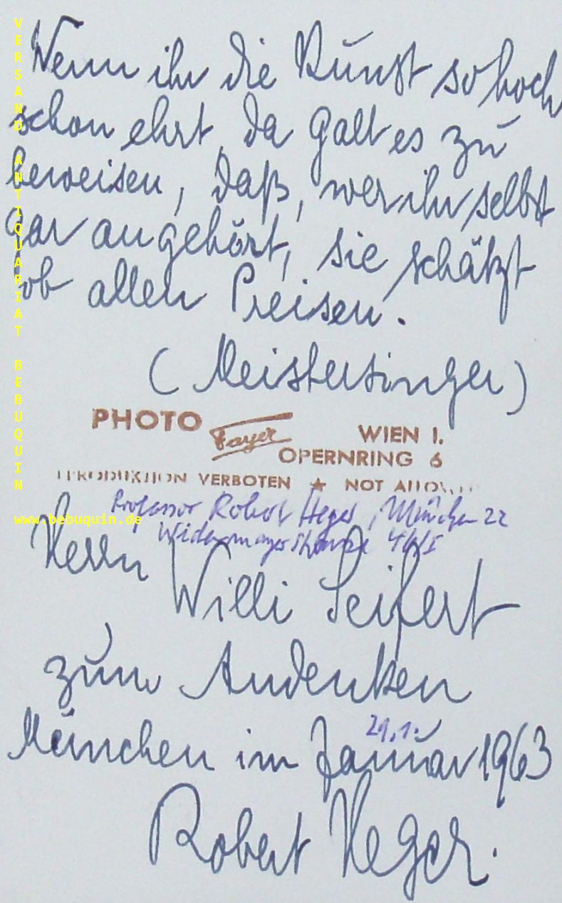 HEGER, Robert (Dirigent, Komponist): eigenhändig signierte Fotopostkarte (Foyer), die rückseitig mit Meistersinger-Zitat und einem persönlichen voll signierten Gruss an Willi Seifert versehen ist. München, 1963. 13,5 x 8,5 cm. 1 Bl. Robert Heger (* 19. August 1886 in Straßburg, Deutsches Reich; † 14. Januar 1978 in München) war ein deutscher Dirigent, Komponist und Hochschullehrer. (Wikipedia)