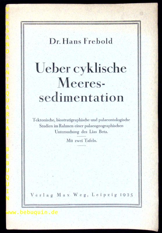 MEERESKUNDE.– FREBOLD, Hans: Über cyklische Meeressedimentation. Tektonische, biostratigraphische u. palaeontologische Studien im Rahmen e. palaeogeographischen Untersuchung des Lias Beta. Leipzig (Max Weg), 1925. Gr. 8°. 58 S. mit 2 Tafeln. OKart. EA.
