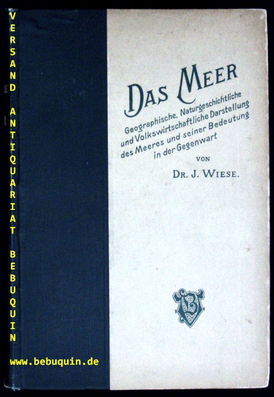 MEERESKUNDE.– WIESE, Josef: Das Meer. Geographische, naturgeschichtliche und volkswirtschaftliche Darstellung des Meeres und seiner Bedeutung in der Gegenwart. Berlin (Schall), 1906. Gr. 8°. 424 S. mit zahlr. Bildern und Karten. OHLn. Deckel leicht berieben , sonst gutes Ex. ea