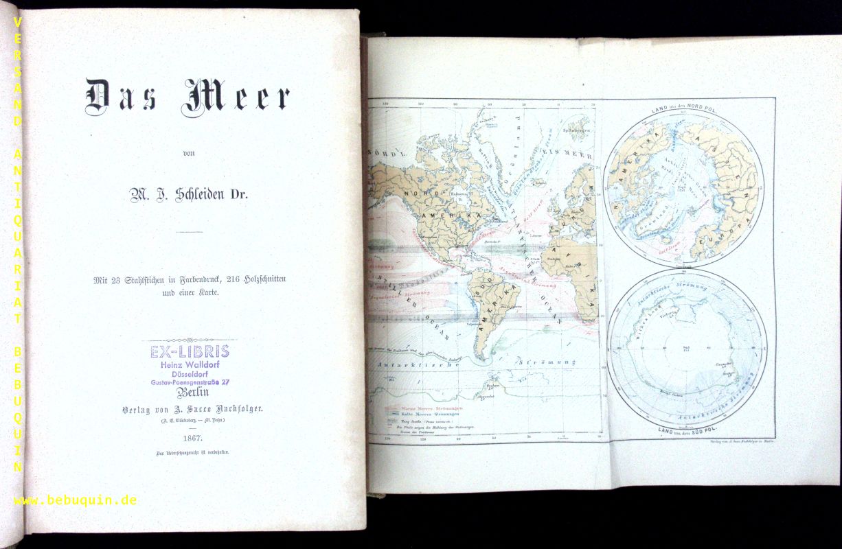 MEERESKUNDE.– SCHLEIDEN, Matthias Jacob: Das Meer. Berlin (Sacco), 1867. 4°. XII, 709 S. mit 23 Stahlst. in Farbendruck, 216 Holzschn. u. 1 Karte. HLn ca 1900. Kanten etwas berieben, Papier besonders an den Rändern gebräunt. EA.