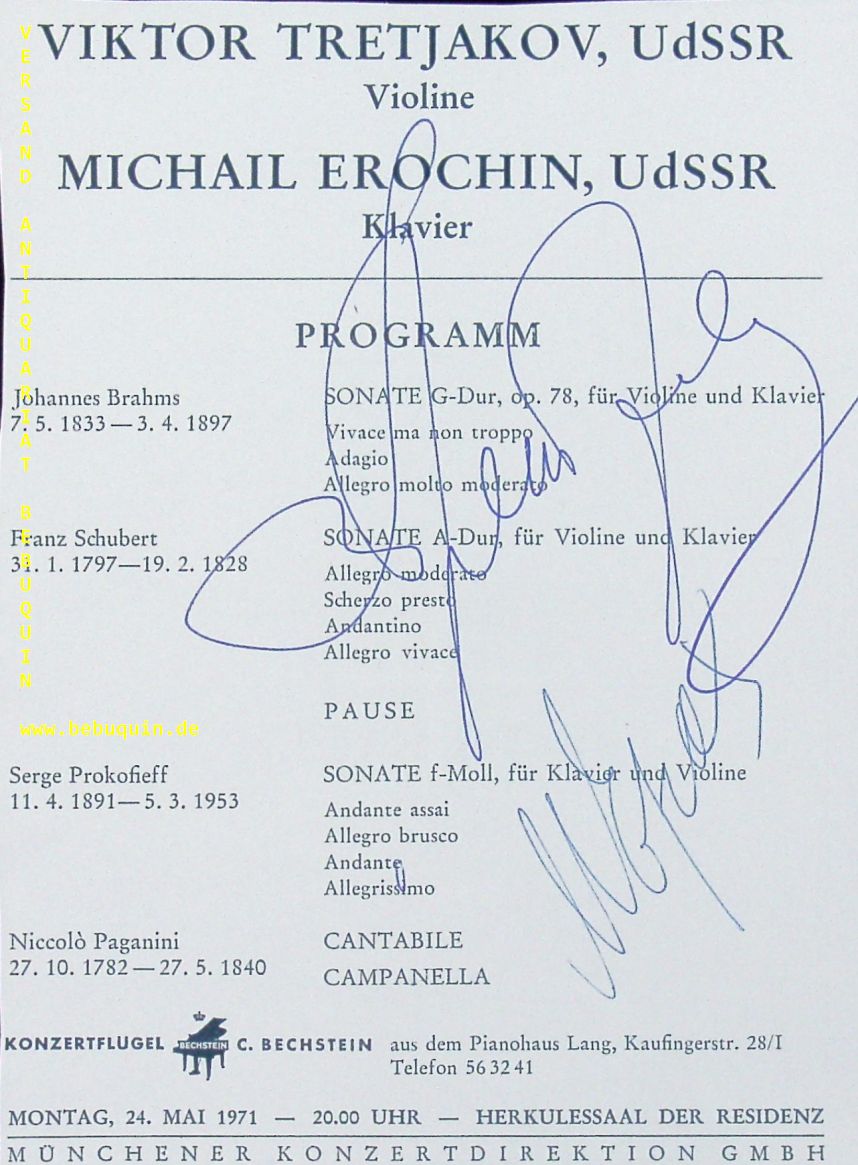 TRETJAKOW, Viktor (Violinist) + JERROCHIM, Michail (Pianist): eigenhändig von beiden signierte Programmseite. München (Herkulessaal), 24.5.1971. 17 x 12,5 cm. 1 Bl. Wiktor Wiktorowitsch Tretjakow (* 17. Oktober 1946 in Krasnojarsk, Sibirien) ist ein russischer Violinist und Dirigent. (Wikipedia)