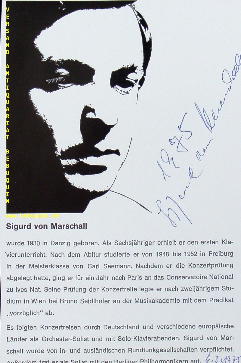MARSCHALL, Sigurd von (Pianist): eigenhändig signierte und datierte Portraitseite. München (Philharmonie), 6.3.1975. 19 x 13 cm. 1 Bl.