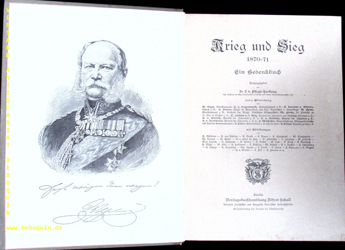 1870/71.– PFLUGK-HARTTUNG, J. von: Krieg und Sieg. 1870-71. Ein Gedenkbuch. Berlin (Schall & Grund), 1895. 4°.ö XI, 645 [4] S. mit zahlr. teils gefalteten Abb., Bildtafeln und Karten. reich verziertes OLn mit Goldprägung. vereinzelt braunfleckig.