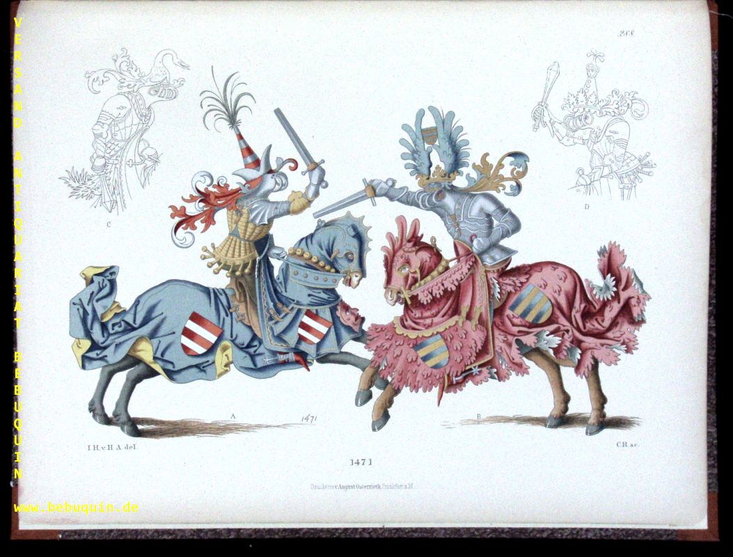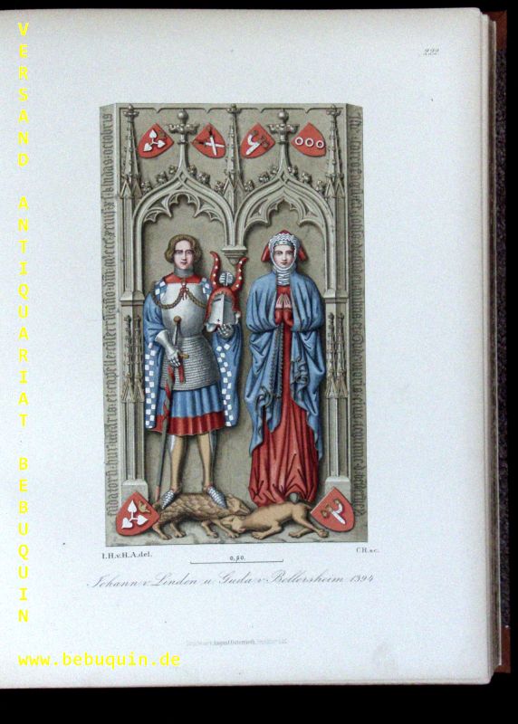 MODE.– HEFNER-ALTENECK, Jakob Heinrich von: Trachten, Kunstwerke und Geräthschaften vom frühen Mittelalter bis Ende des 18. Jahrhunderts nach gleichzeitigen Originalen. 4. Band. 2., verm. u. verb. Aufl. Frankfurt am Main (Heinrich Keller), 1883. Gr. 4“. 31 (3) S.+ 72 farb. Tafeln 217 – 288.. neuer HLn. mit historischem Rückenschild. Bibl.St. am Druckvermerk, sonst schönes Ex. Jakob Heinrich Hefner, ab 1856 von Hefner-Alteneck (* 20. Mai 1811 in Aschaffenburg; † 19. Mai 1903 in München) war ein deutscher Kunsthistoriker und Museumsdirektor sowie Zeichner und Radierer. Er machte sich besonders verdient durch die Herausgabe einer Anzahl kunst- und kulturgeschichtlicher Bilderwerke, deren Zeichnungen größtenteils von ihm herrühren. Sie beginnen mit dem Prachtwerk Trachten des christlichen Mittelalters nach gleichzeitigen Kunstdenkmalen (Mannheim 1840), welchem als Seitenstück die in Gemeinschaft mit Carl Becker herausgegebenen Kunstwerke und Gerätschaften des Mittelalters und der Renaissance (Mannheim 1848-63, 180 Tafeln) folgten. Eine neue vermehrte Ausgabe beider Werke unter dem Titel: Trachten, Kunstwerke und Gerätschaften von dem frühen Mittelalter bis Ende des 18. Jahrhunderts veröffentlichte er seit 1879 (120 Lieferungen). (Wikipedia)